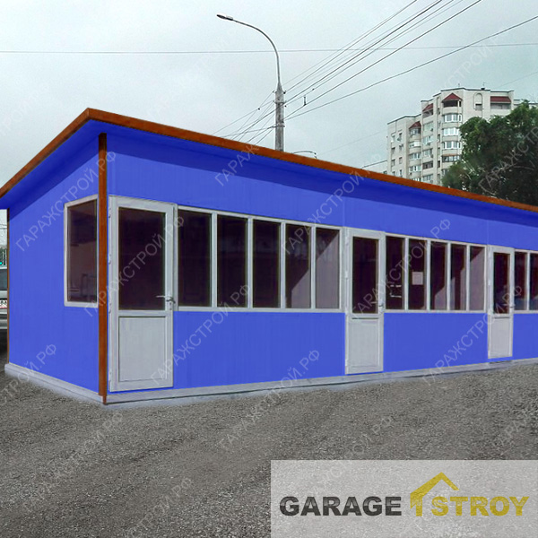 Комплекс торговых павильонов (торговый ряд павильонов) из сэндвич-панелей размером 18 на 3м, состоящий из 3 торговых павильонов, каждый из которых имеет отдельный вход. Возможно строительство из сэндвич-панелей любого количества торговых павильонов в ряд.